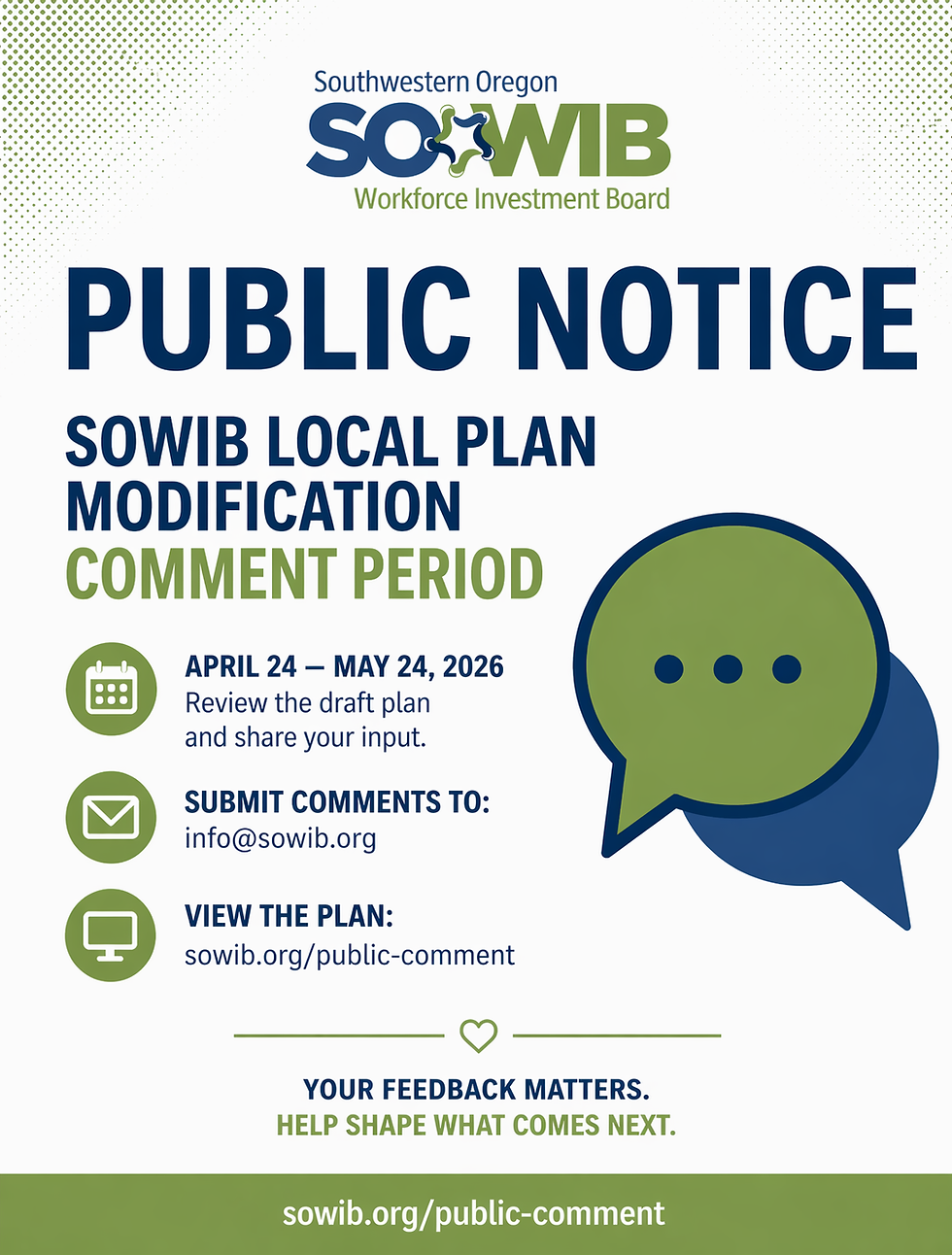 The Southwestern Oregon Workforce Investment Board (SOWIB), serving Coos, Curry, and Douglas counties, is seeking public input on a proposed modification to its Four-Year Local Plan (2024–2028) for Adult, Dislocated Worker, and Youth programs under the Workforce Innovation and Opportunity Act of 2014.